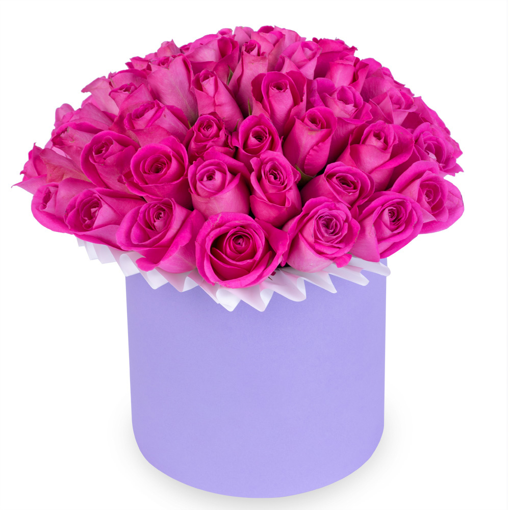 Букет из 35 розовых роз в фиолетовой шляпной коробке