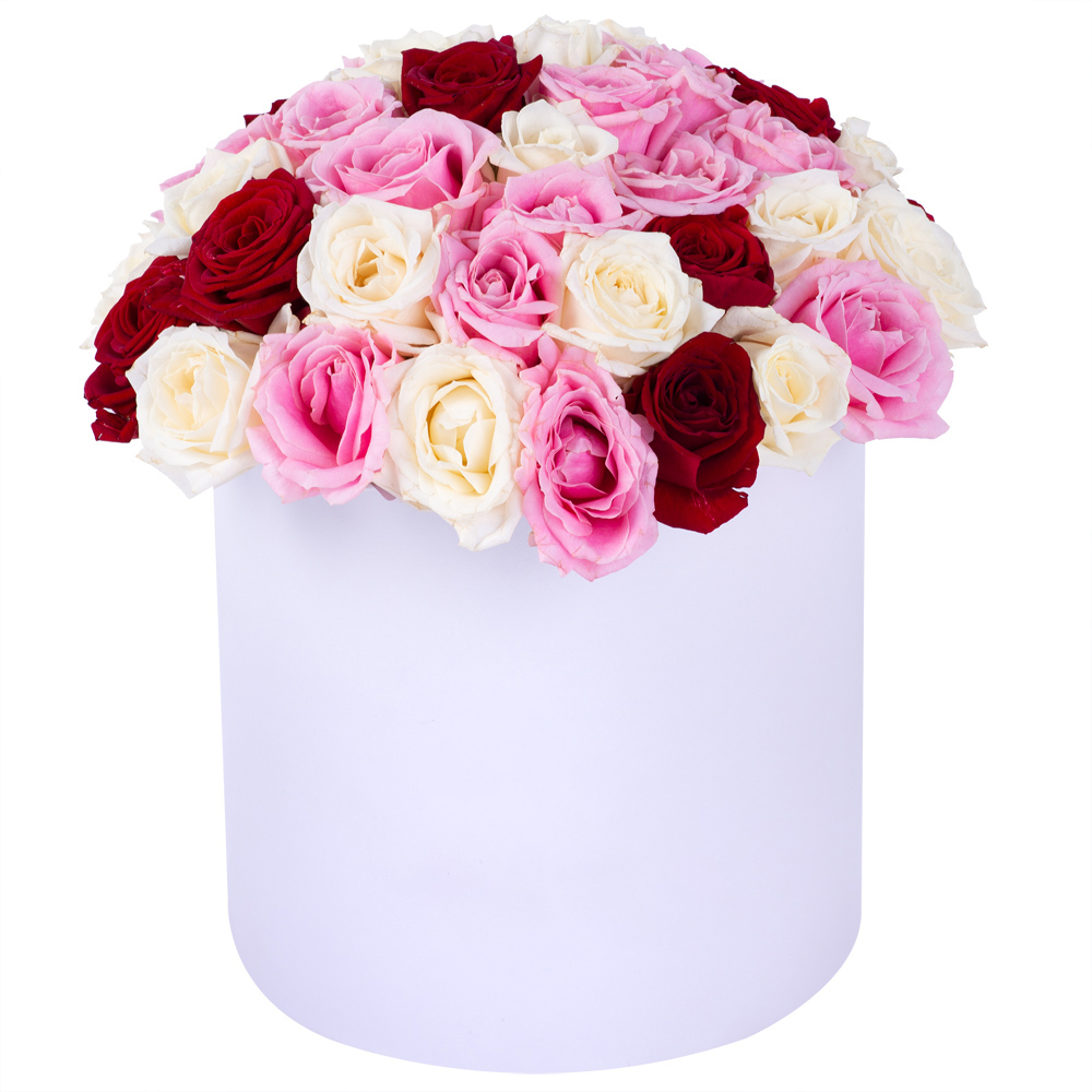 Букет из 51 разноцветной розы premium в белой шляпной коробке
