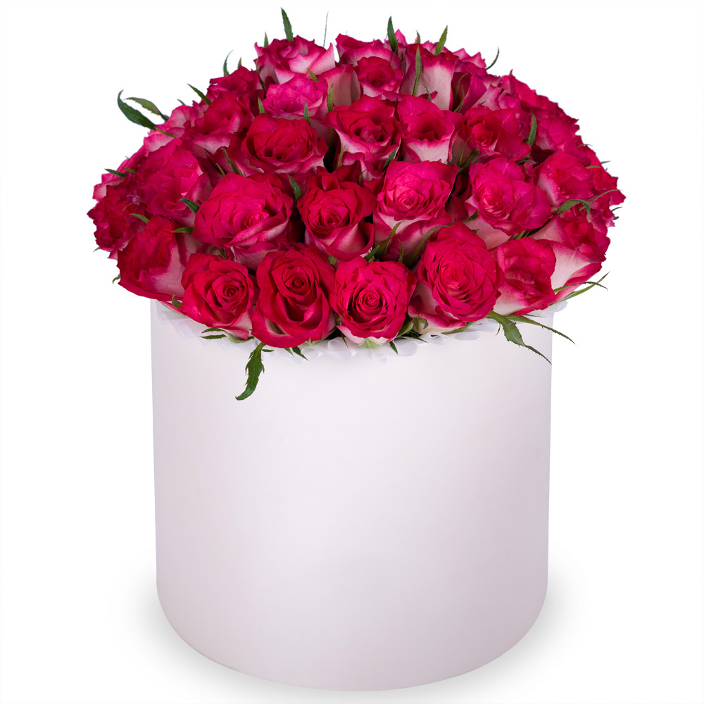 Букет из 51 бело-малиновой розы в кремовой шляпной коробке