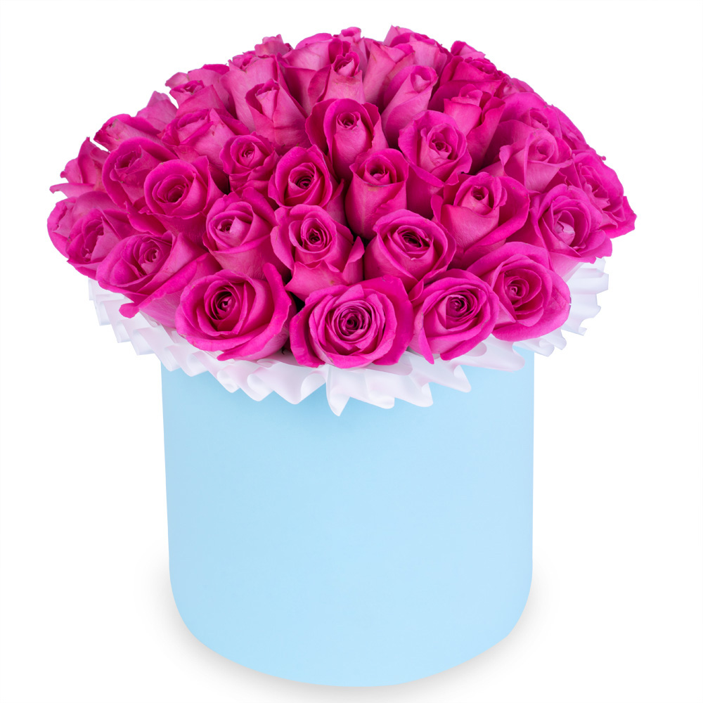 Букет из 35 розовых роз в голубой шляпной коробке