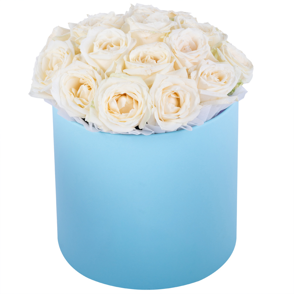 Букет из 19 белых роз premium в голубой шляпной коробке