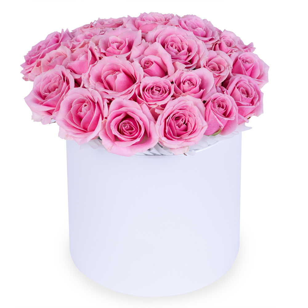 Букет из 25 розовых роз premium в белой шляпной коробке