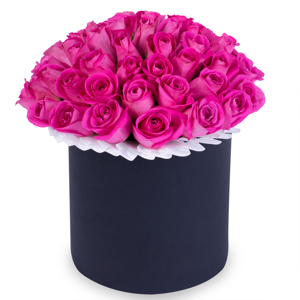 Букет из 35 розовых роз в черной шляпной коробке