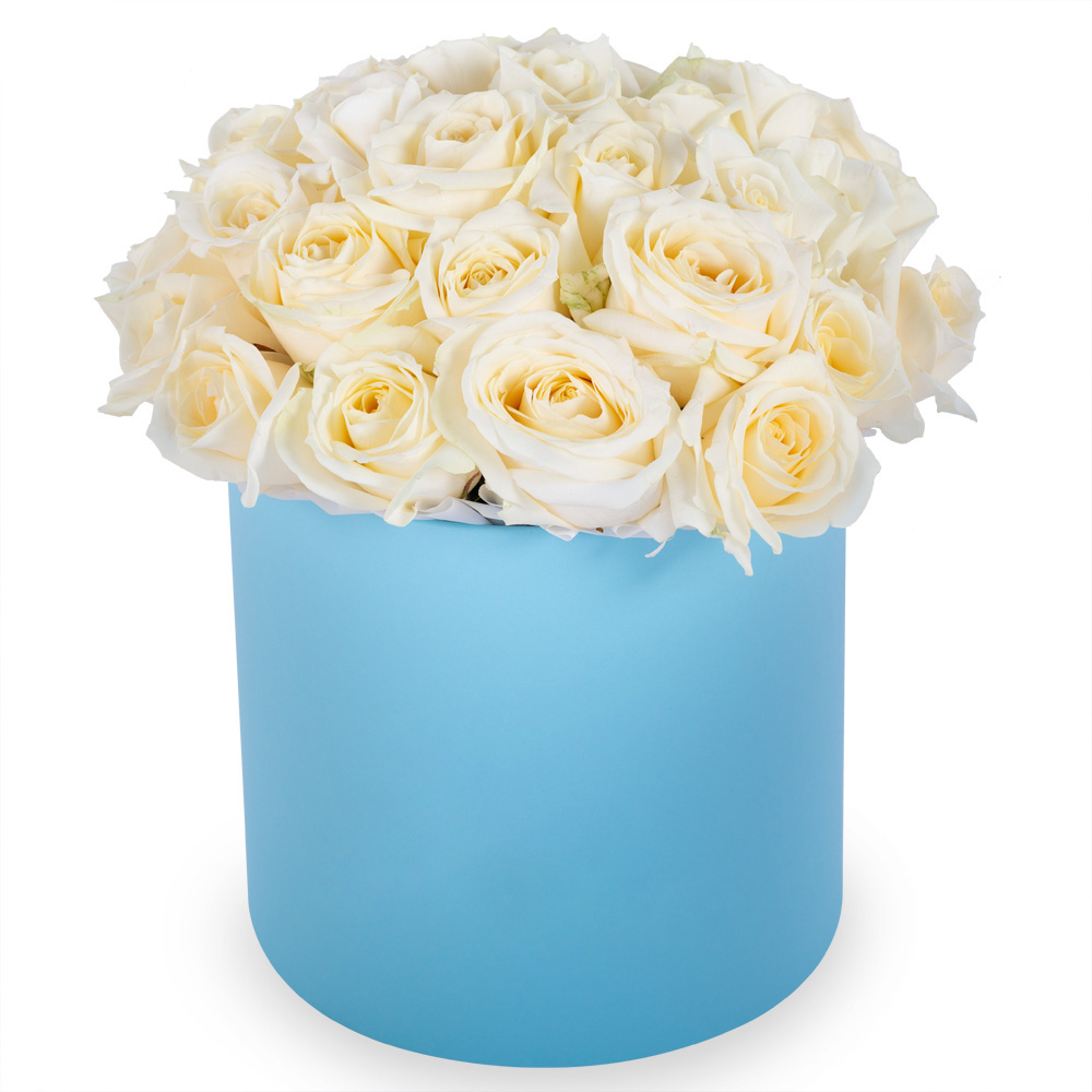 Букет из 35 белых роз premium в голубой шляпной коробке