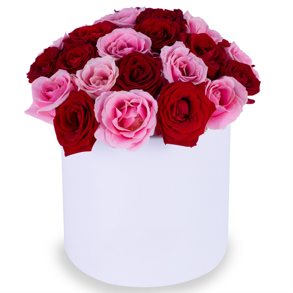 Букет из 35 разноцветных роз premium в белой шляпной коробке