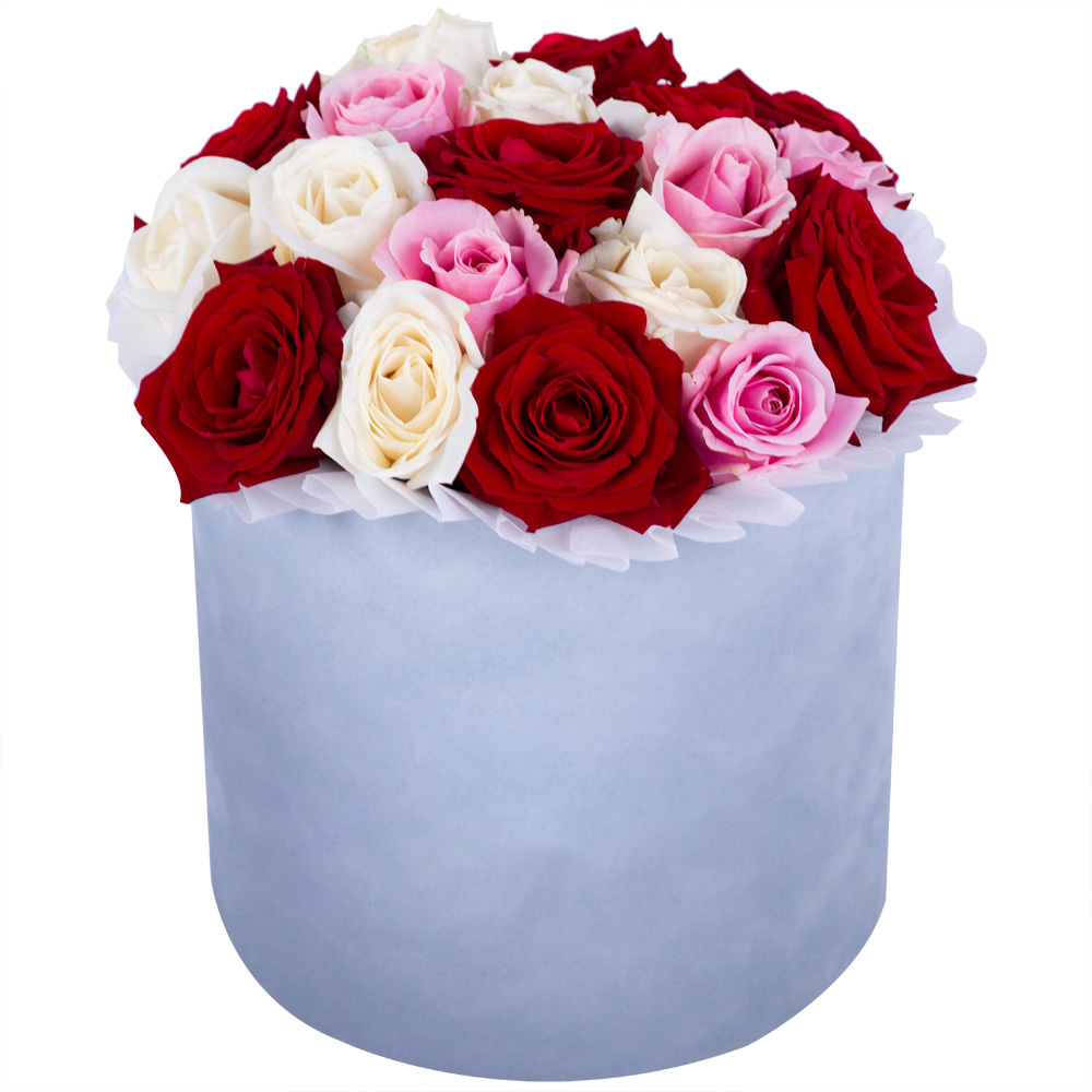 Букет из 19 разноцветных роз premium в серой бархатной шляпной коробке