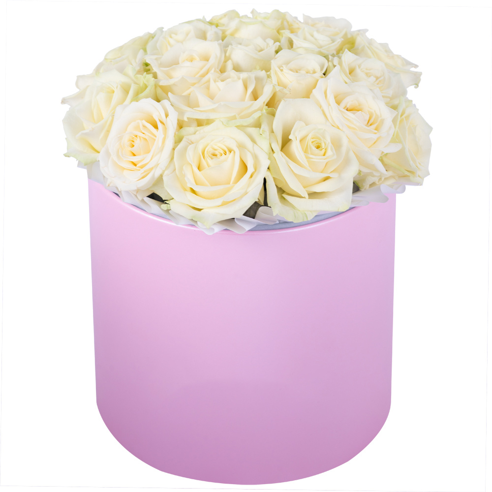 Букет из 21 белой розы premium в розовой шляпной коробке
