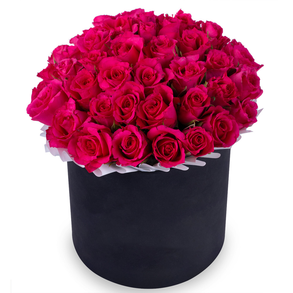 35 малиновых роз в черной шляпной коробке