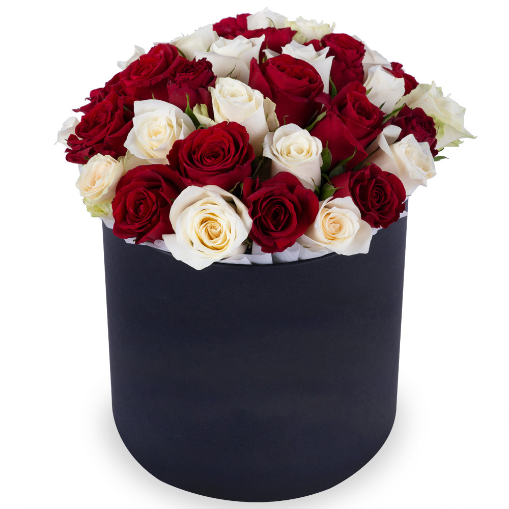 35 разноцветных роз в черной шляпной коробке
