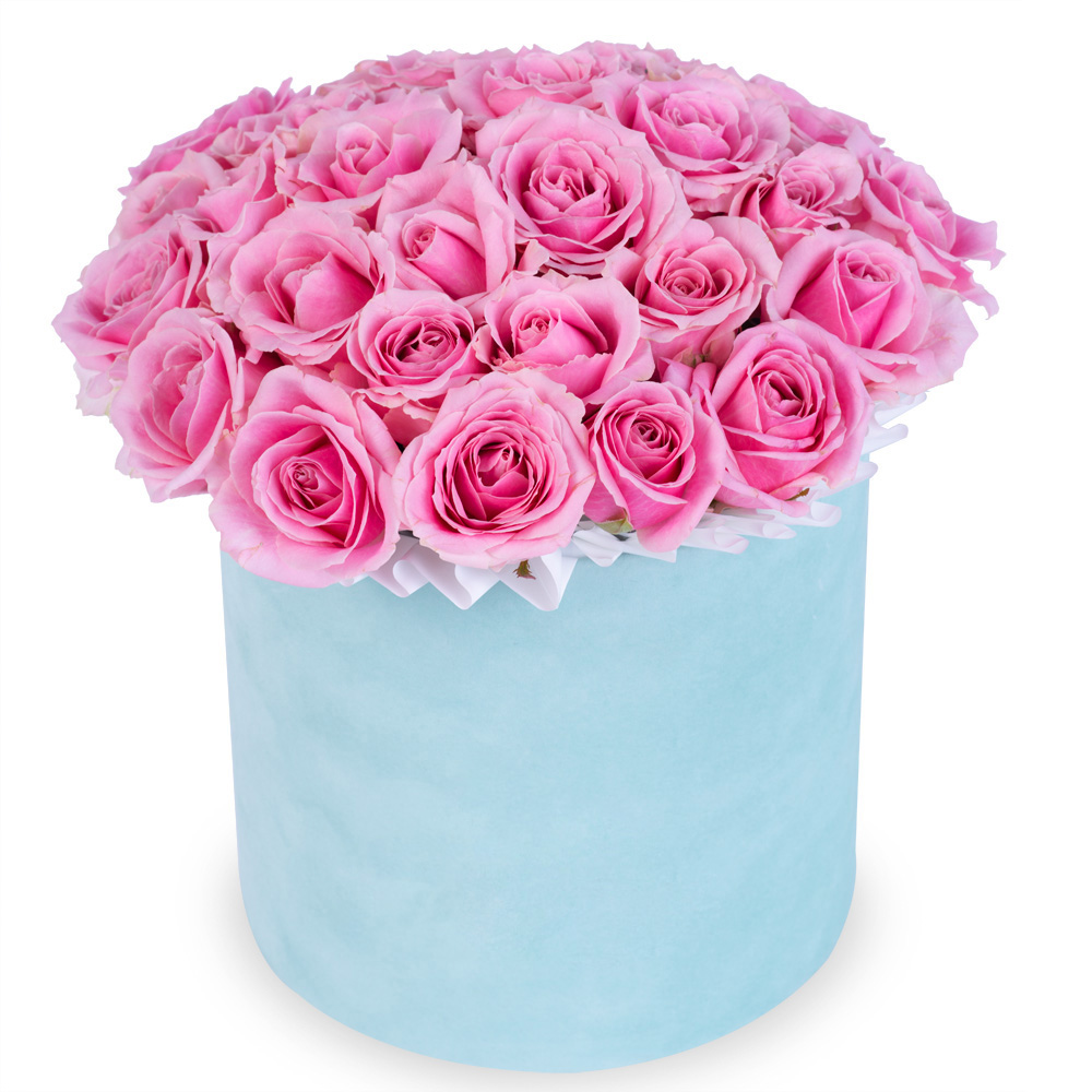 Букет из 25 розовых роз premium в зеленой бархатной шляпной коробке