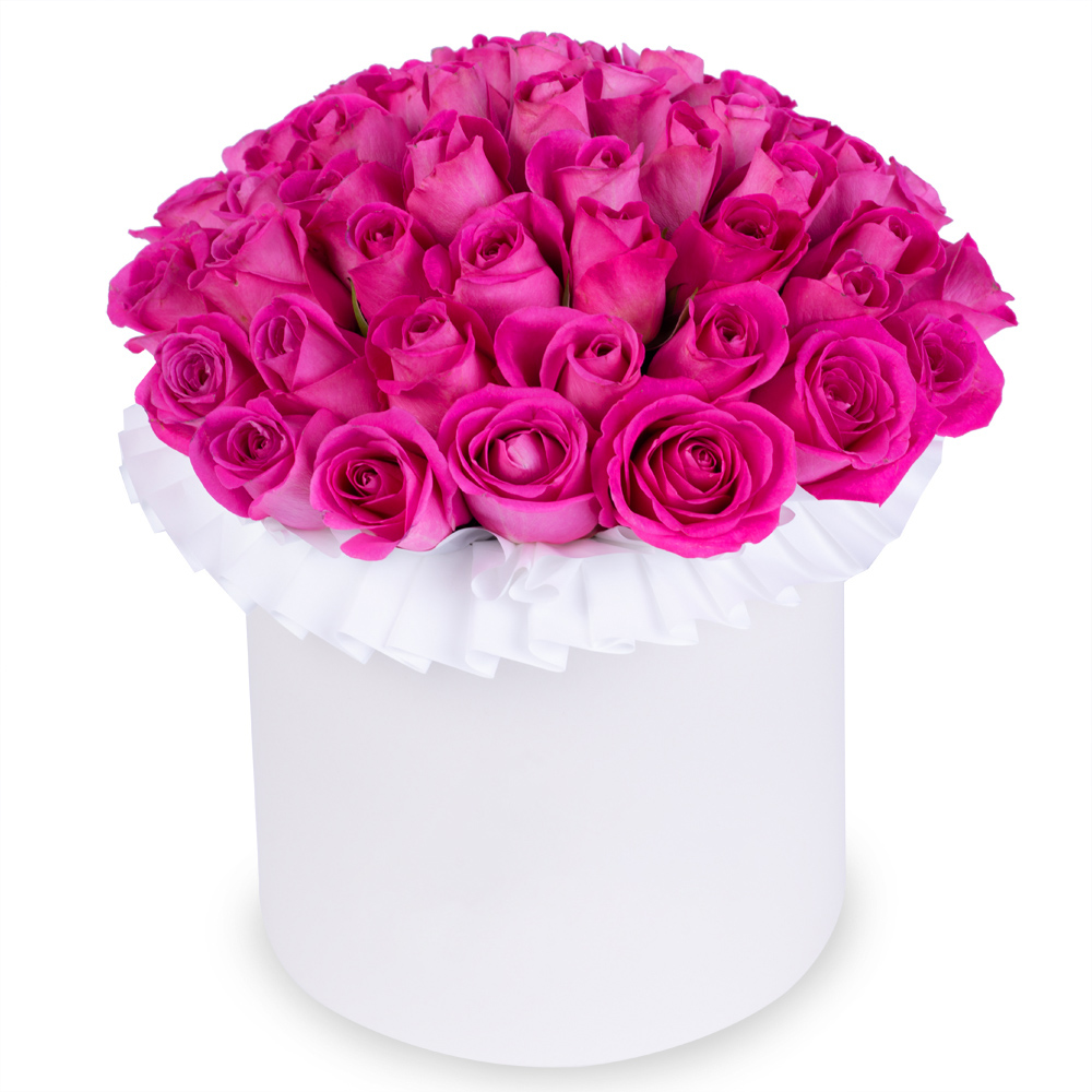 Букет из 35 розовых роз в кремовой шляпной коробке