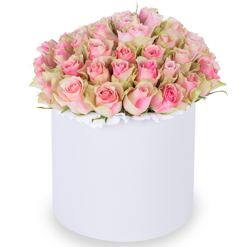 Букет из 75 бело-розовых роз в белой шляпной коробке