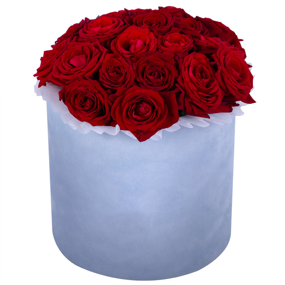 Букет из 21 красной розы premium в серой бархатной шляпной коробке