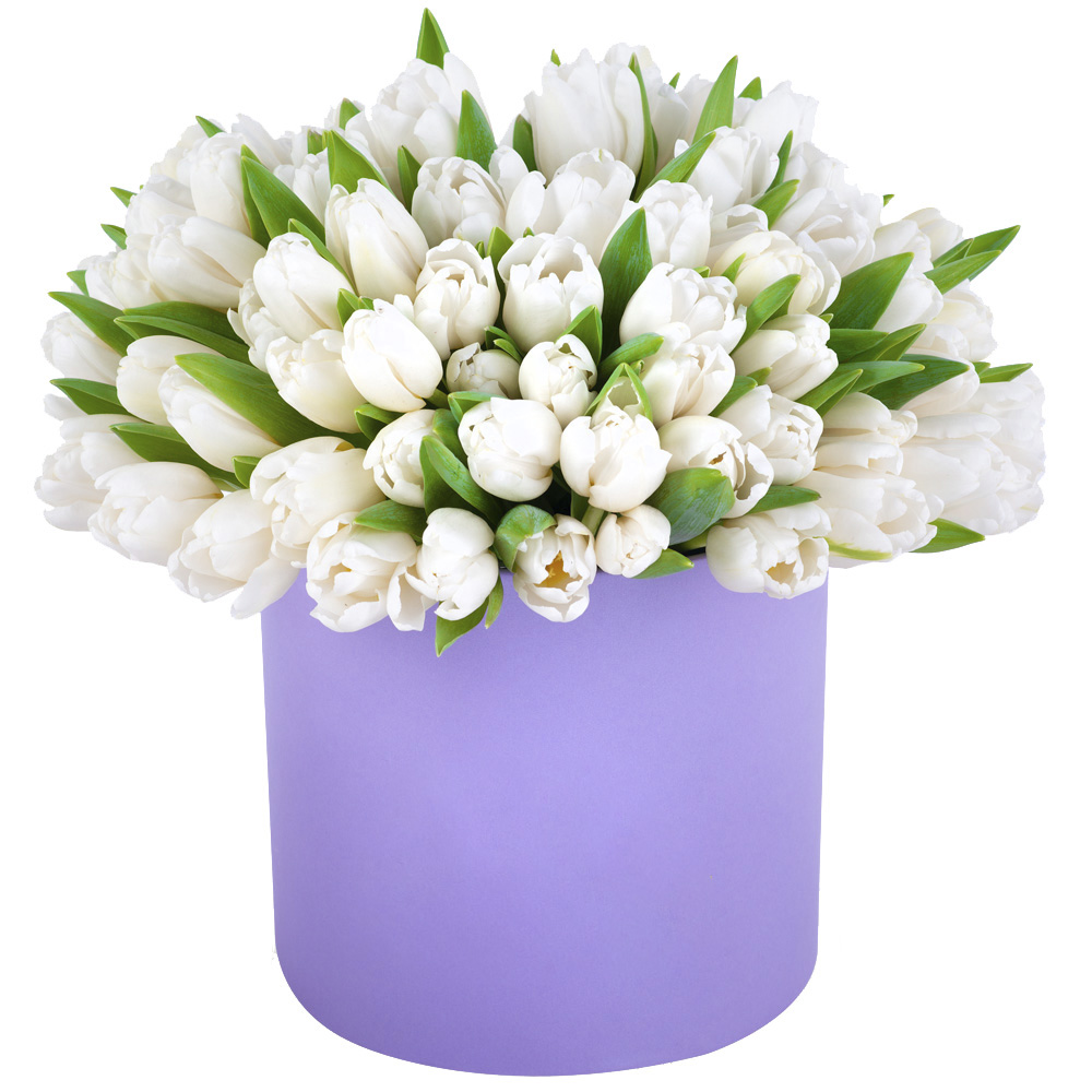 101 белый тюльпан в фиолетовой шляпной коробке