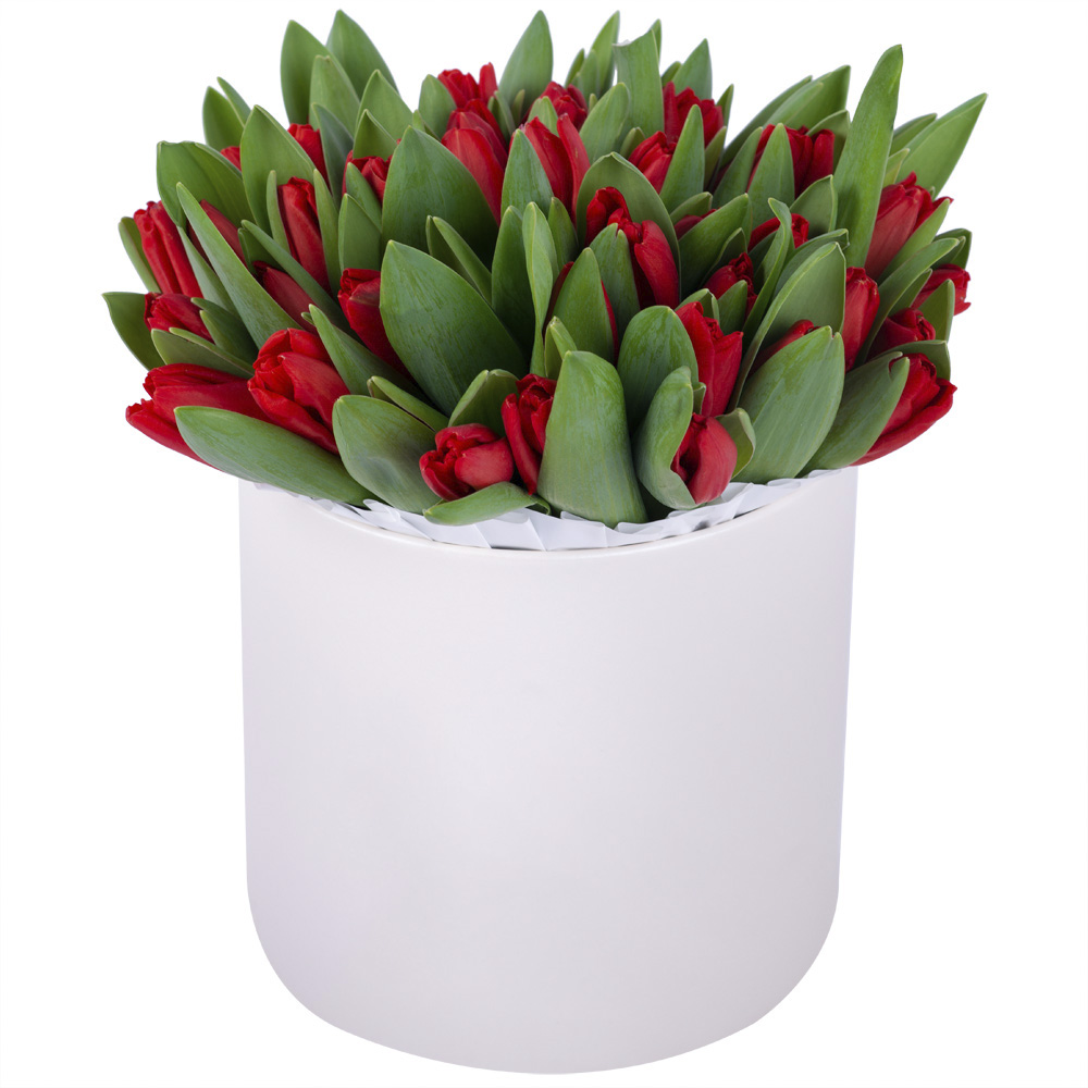 51 красный тюльпан в кремовой шляпной коробке