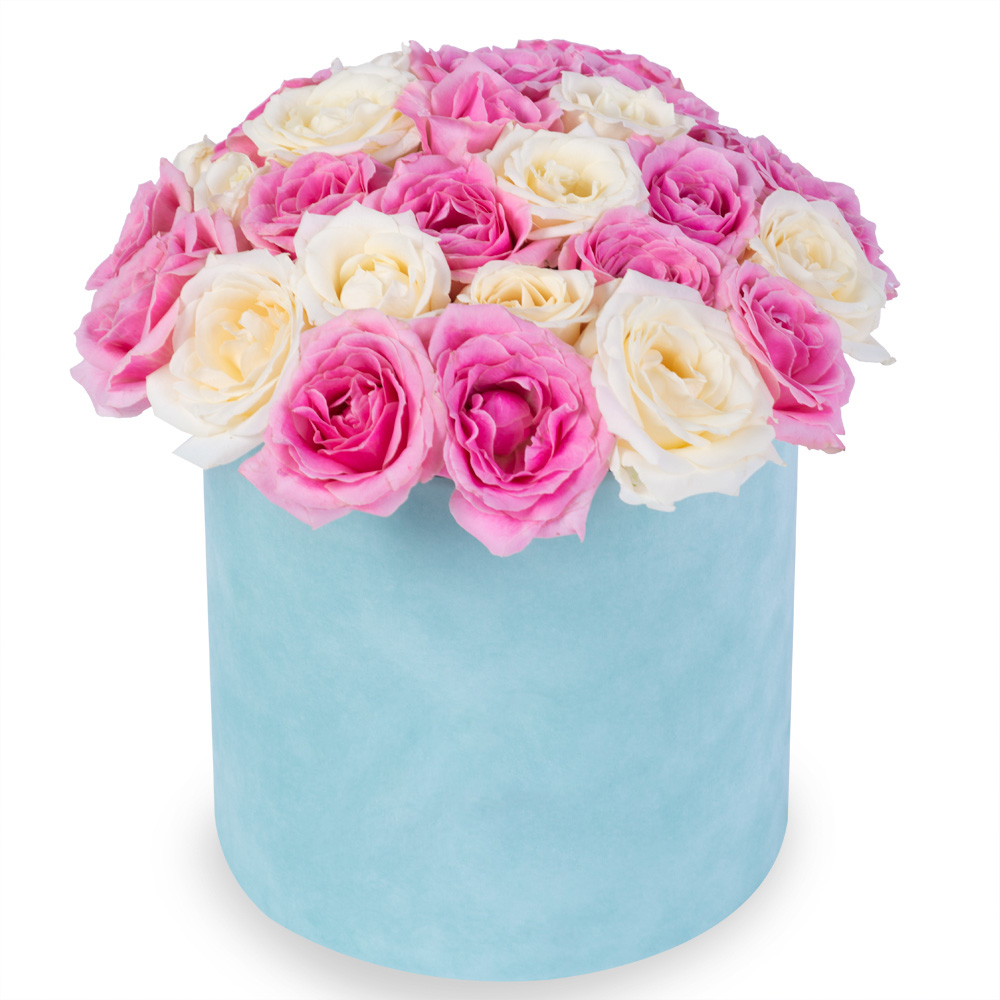 25 разноцветных роз premium в шляпной бархатной коробке