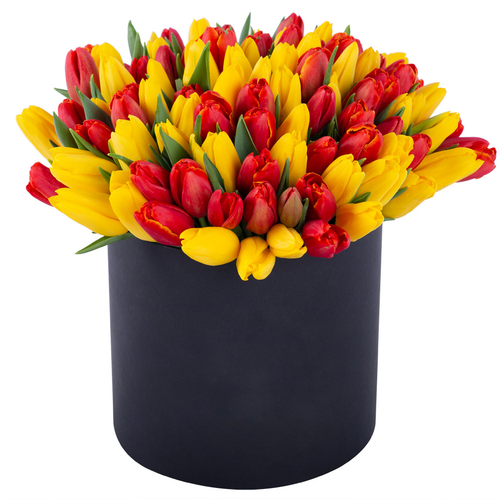 Букет из 101 разноцветного тюльпана в черной шляпной коробке