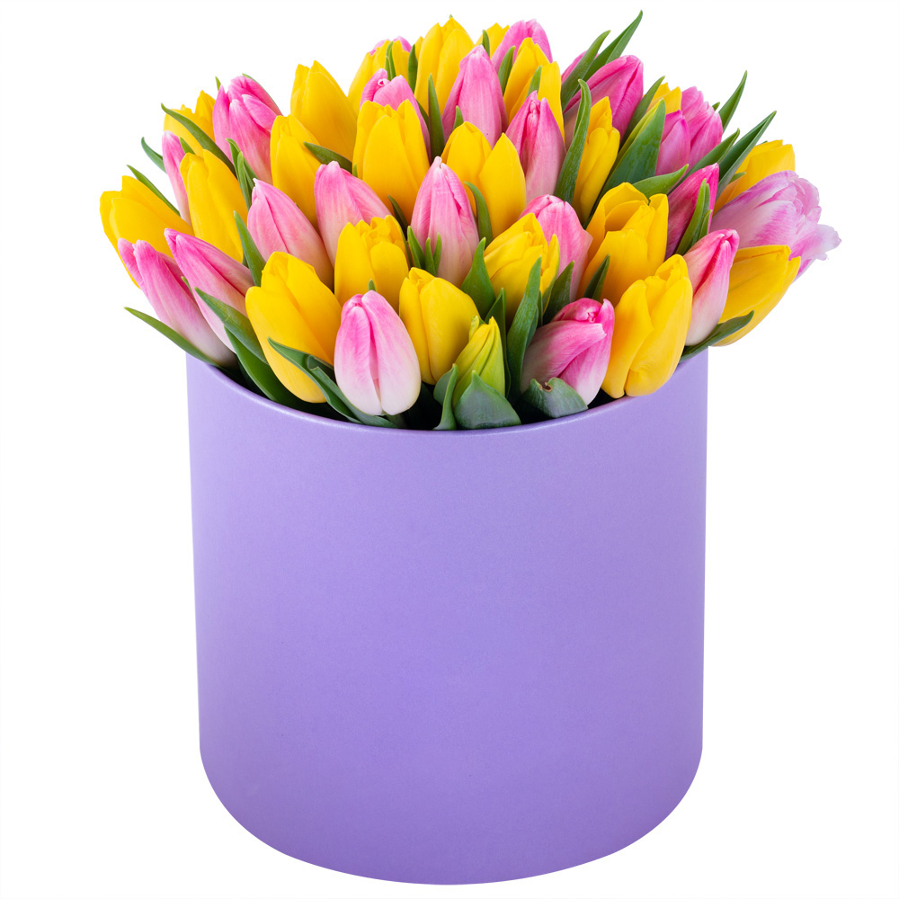 51 разноцветных тюльпан в фиолетовой шляпной коробке