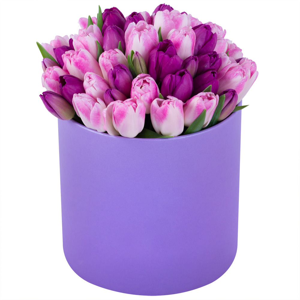 Разноцветный 51 тюльпан в фиолетовой шляпной коробке
