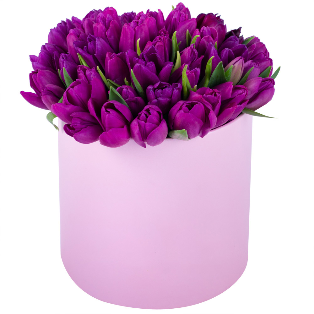 51 фиолетовый тюльпан в розовой шляпной коробке