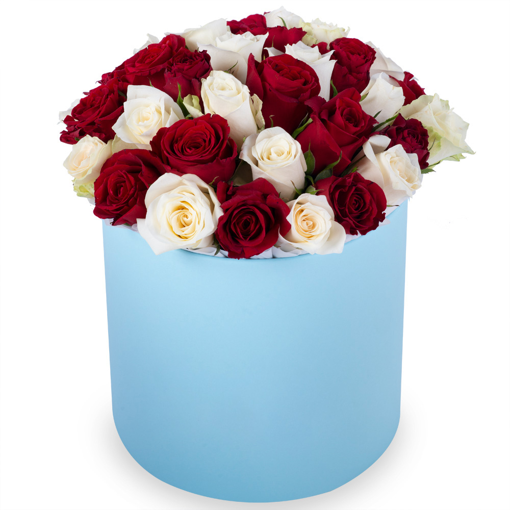 35 разноцветных роз в голубой шляпной коробке