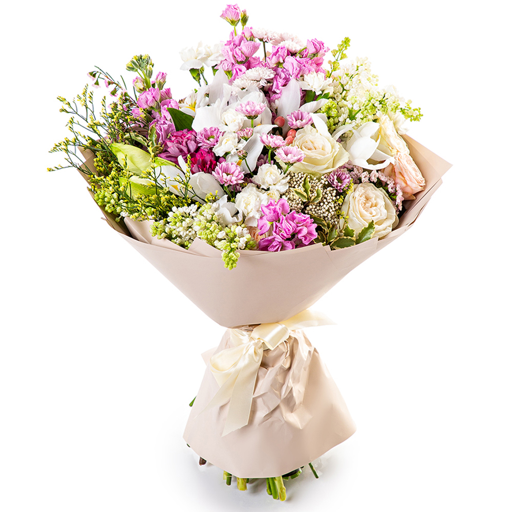 Букет из роз охаро, сирени, гвоздик и лимониума