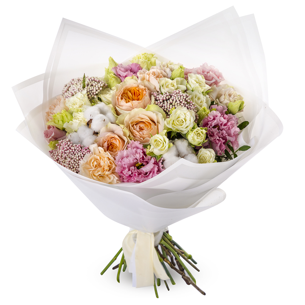 Букет с кустовой розой и хлопком