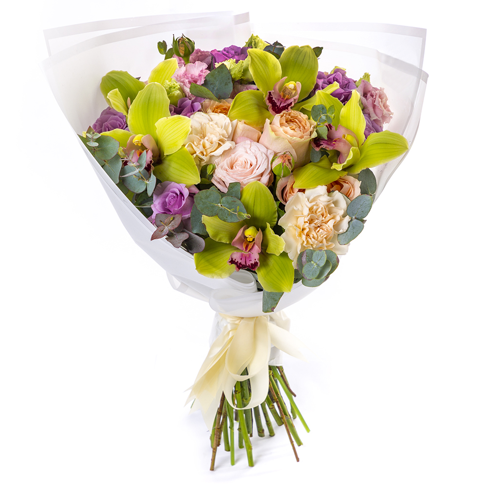 Букет из орхидей, роз и эустомы