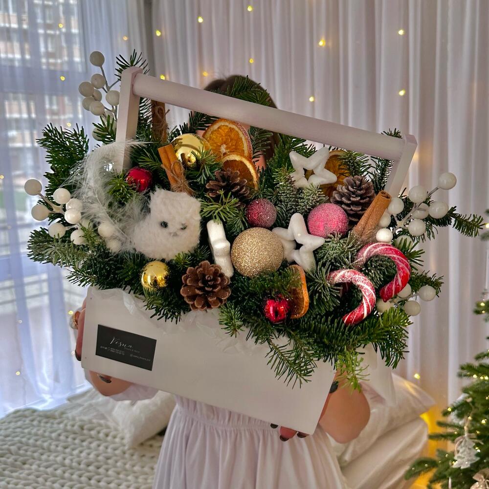 Зимняя композиция с живой елью, леденцами и декором