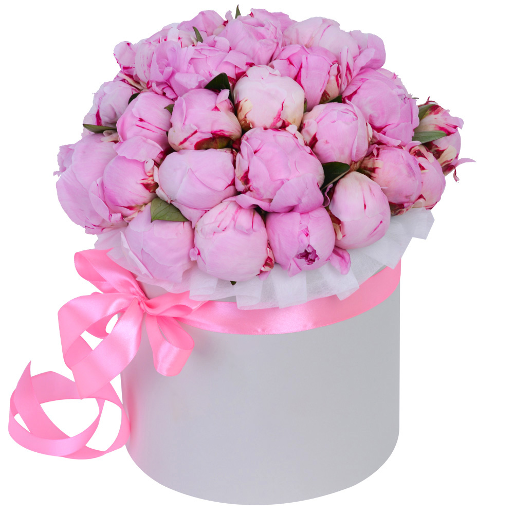 35 розовых пионов в серой бархатной шляпной коробке
