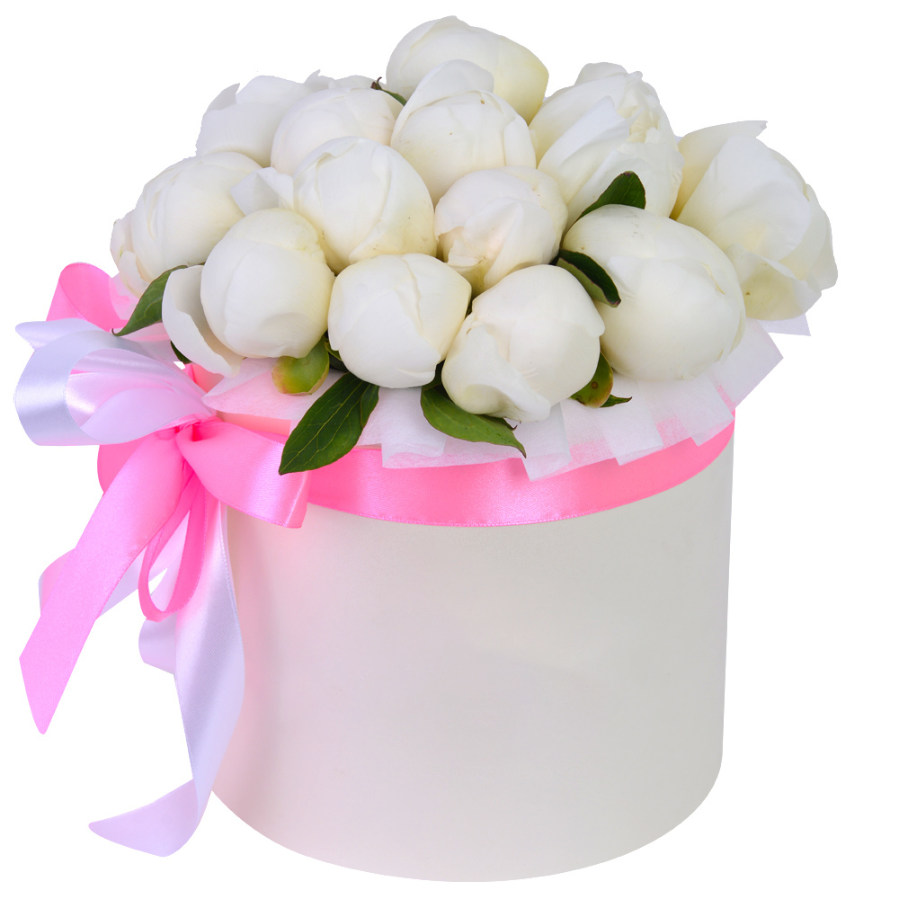Букет из 15 белых пионов в кремовой шляпной коробке