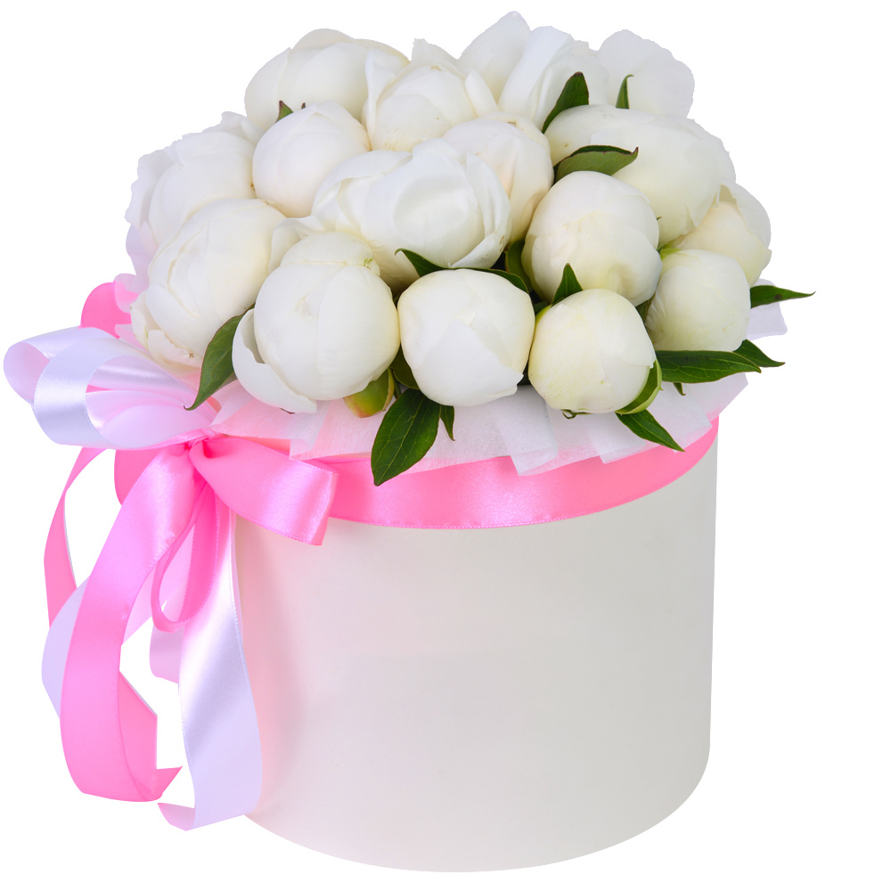 Букет из 19 белых пионов в кремовой шляпной коробке