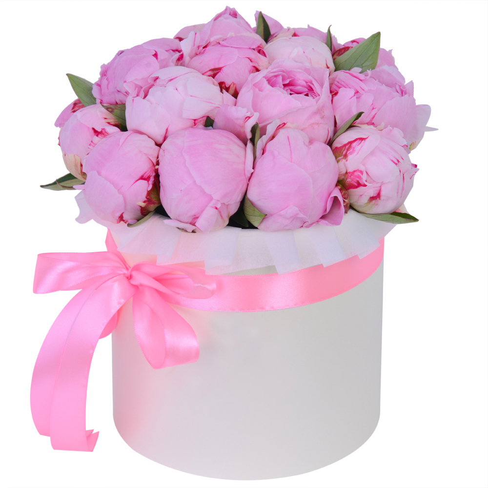 Букет из 19 розовых пионов в кремовой шляпной коробке