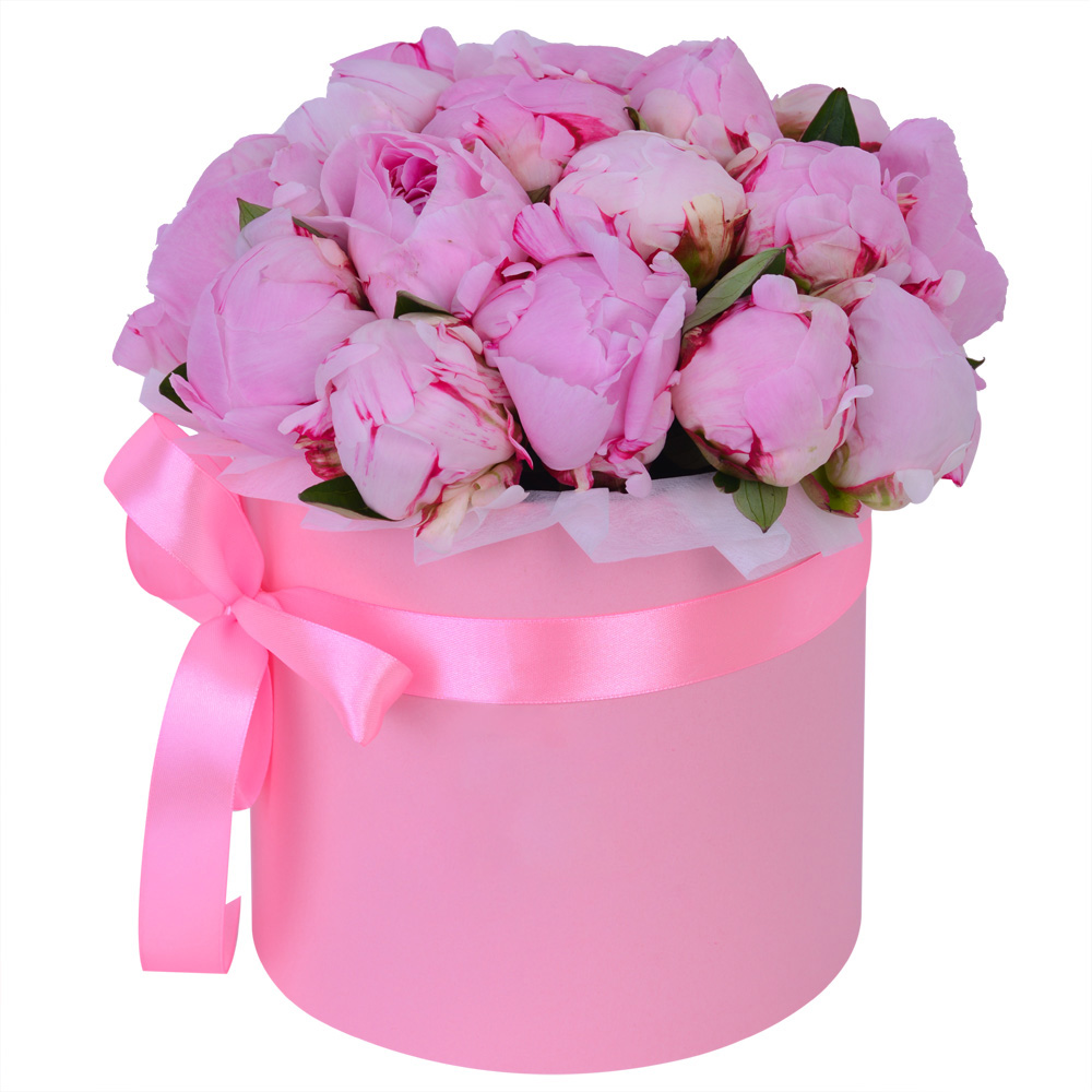 Букет из 19 розовых пионов в розовой шляпной коробке