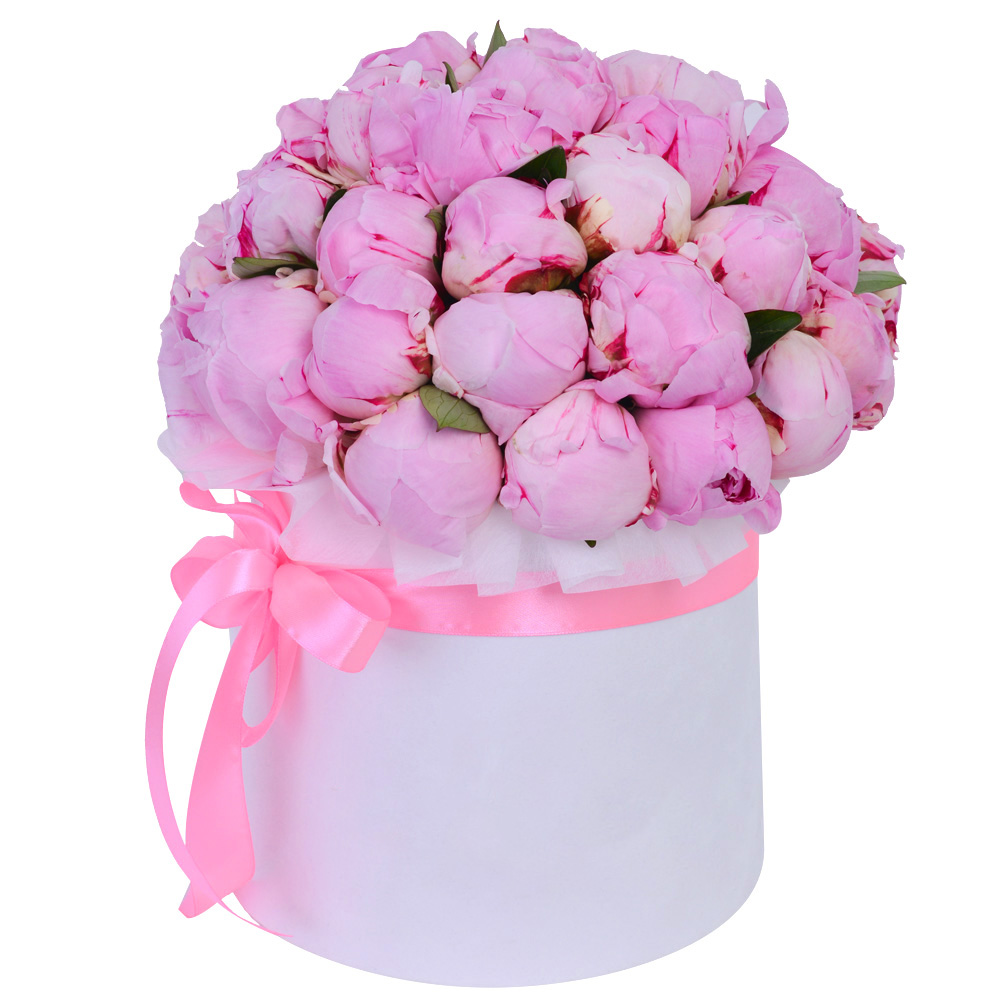 Букет из 35 розовых пионов в белой шляпной коробке