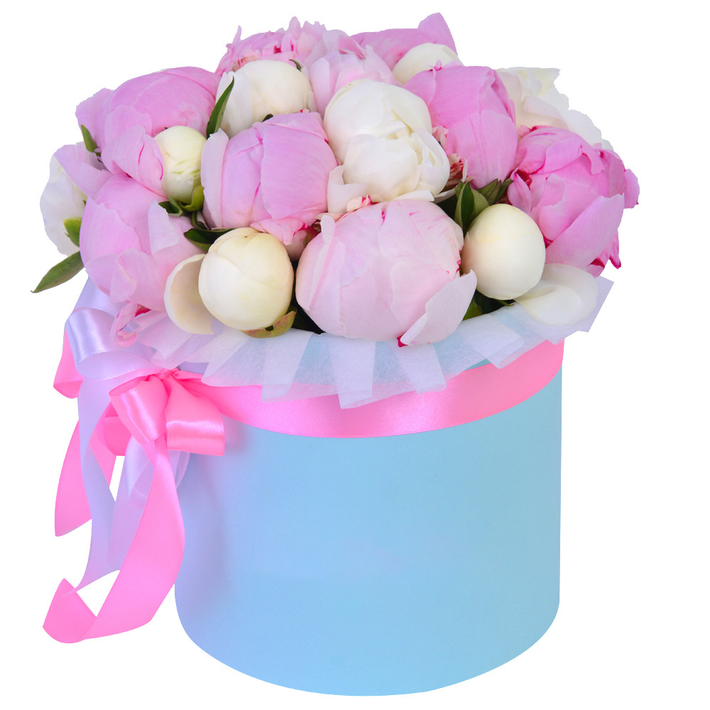 Букет из 21 разноцветного пиона в голубой шляпной коробке