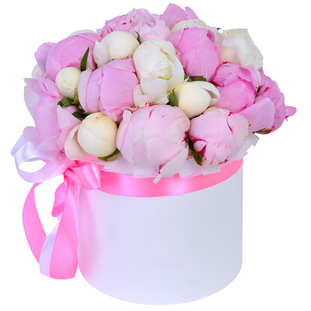 Букет из 25 разноцветных пионов в белой шляпной коробке