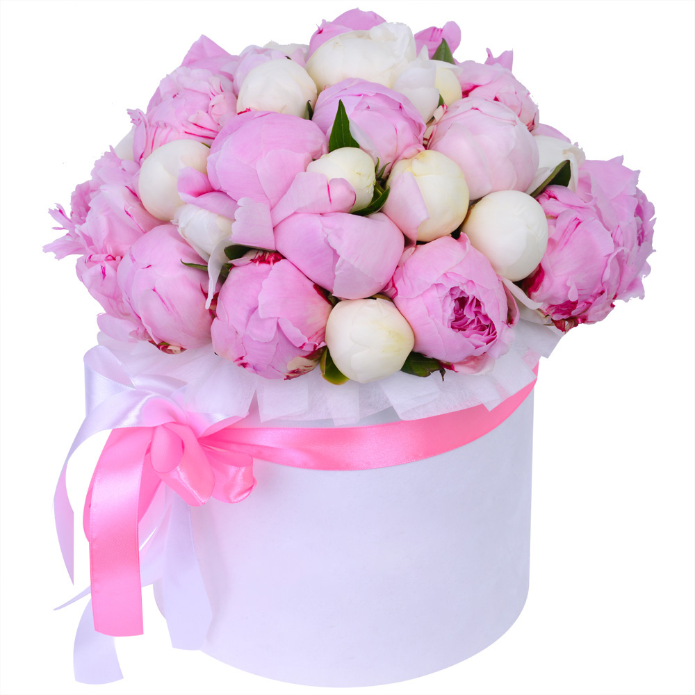 Букет из 35 разноцветных пионов в белой шляпной коробке