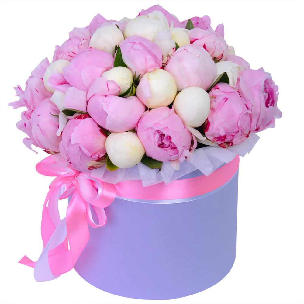 Букет из 35 разноцветных пионов в фиолетовой шляпной коробке
