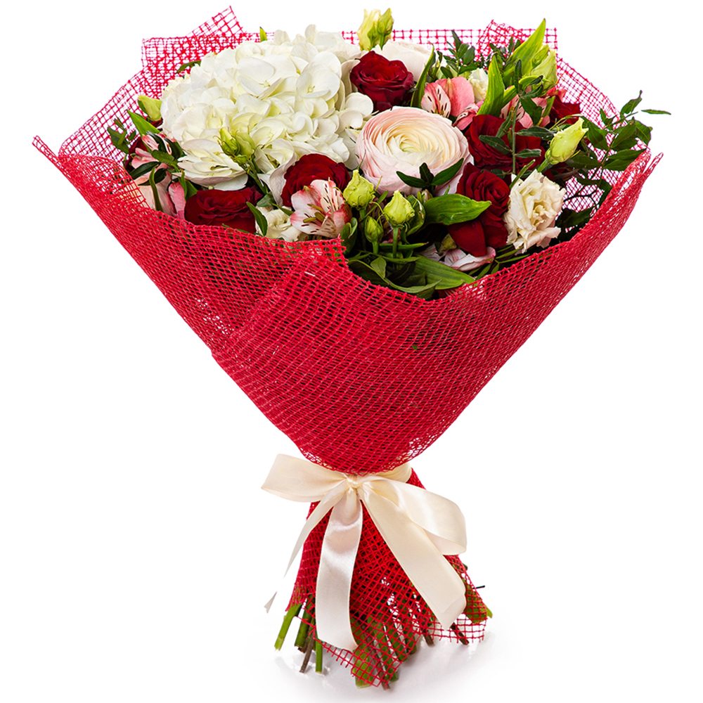Букет с ранункулюсом, розой и гортензией