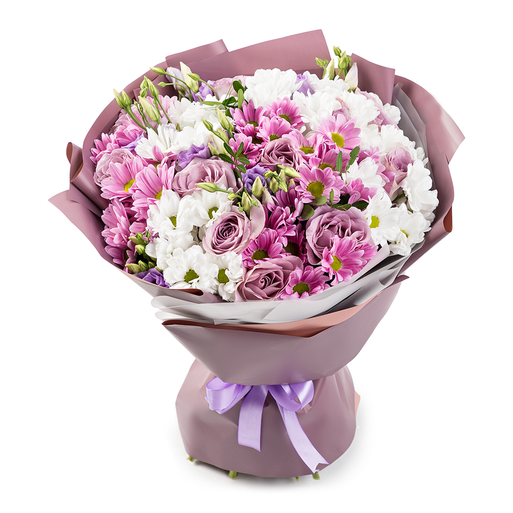 Букет из кустовых роз, альстромерий, пионов и хризантем