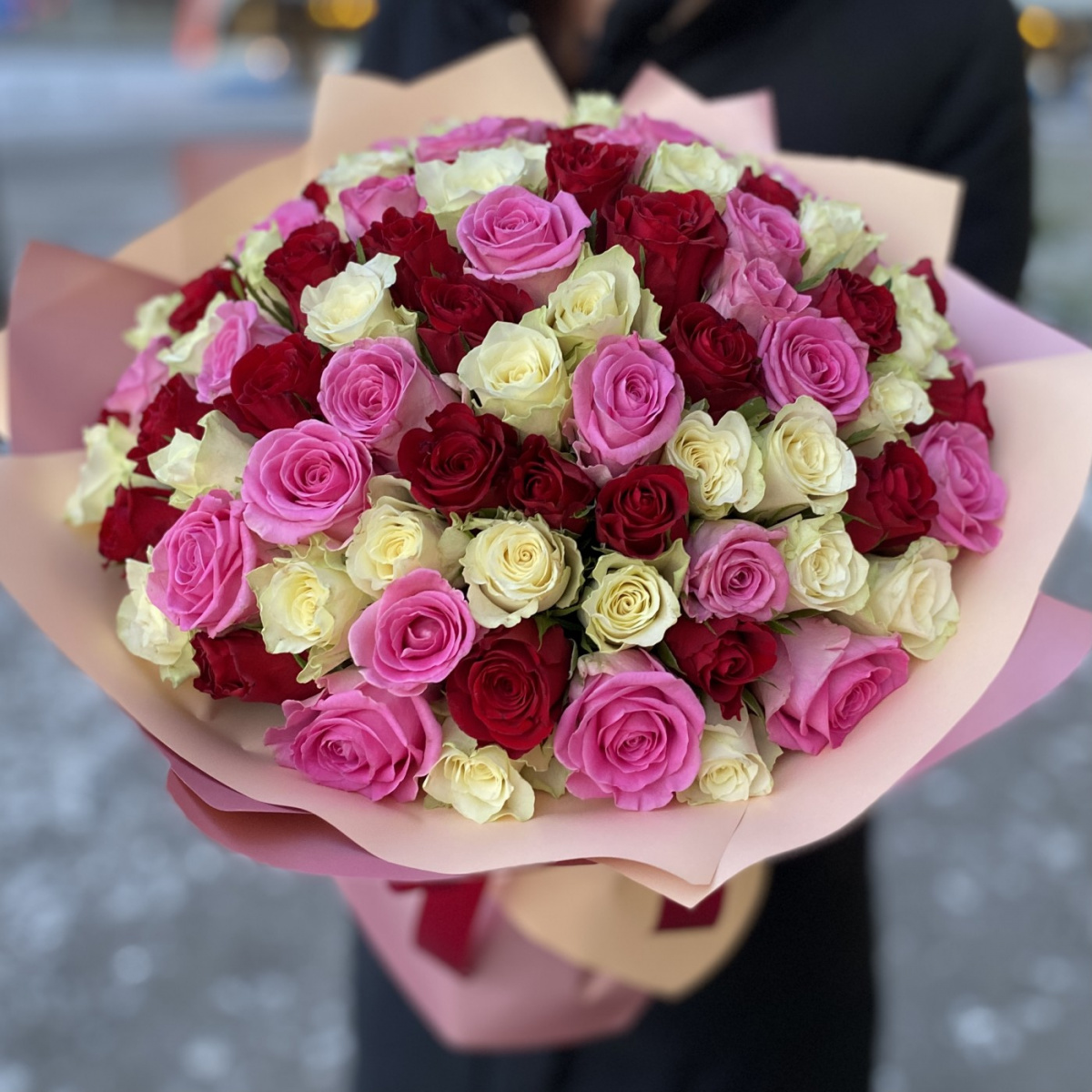 Букет «Классический микс» с 101 розой — это нечто большее, чем просто цветы. Он представляет собой великолепное сочетание розовых, кремовых и красных бутонов, которые гармонично складываются в уникальную цветочную композицию. Этот шикарный подарок идеально подходит для различных торжеств: будь то юбилей, 8 марта, день рождения или День Святого Валентина.