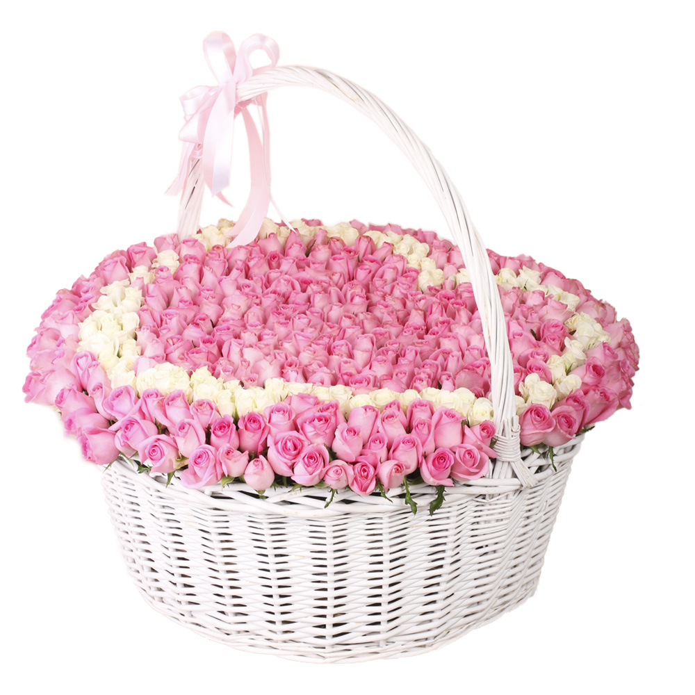 Сердце из 501 розовой и белой розы в корзине