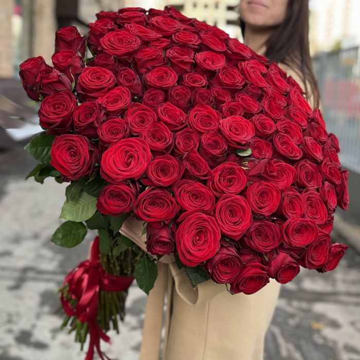 Большой букет роз с ароматными и бархатными алыми бутонaми - поистине великолепный и роскошный подарок на любой случай. Этот букет станет настоящим украшением любого торжества и подарит своему обладателю массу положительных эмоций.