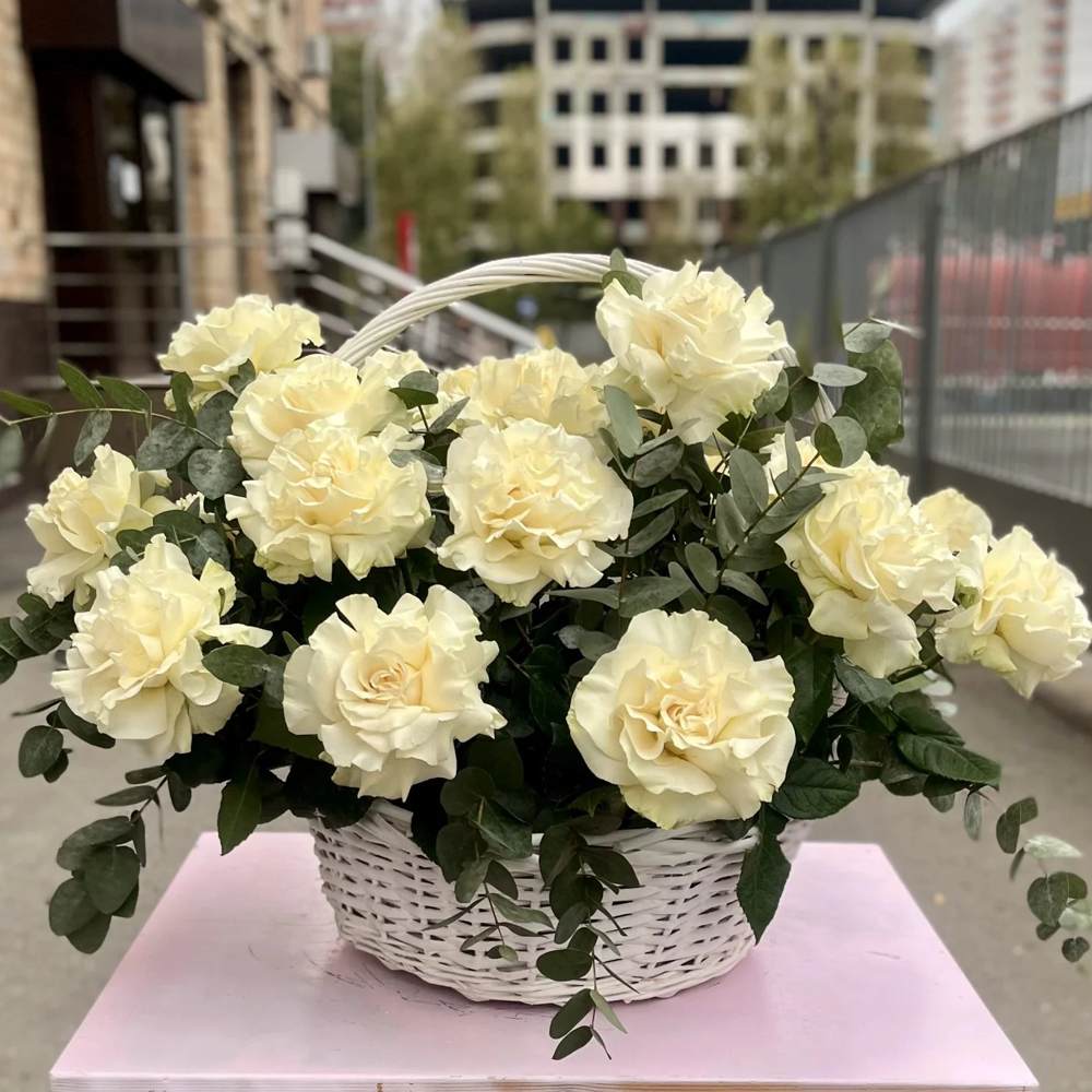 Французская белая роза в корзине 25 шт.