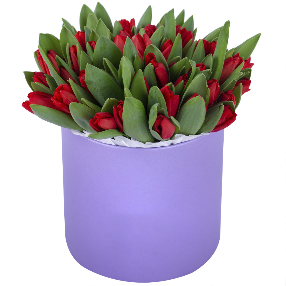 51 красный тюльпан в фиолетовой шляпной коробке