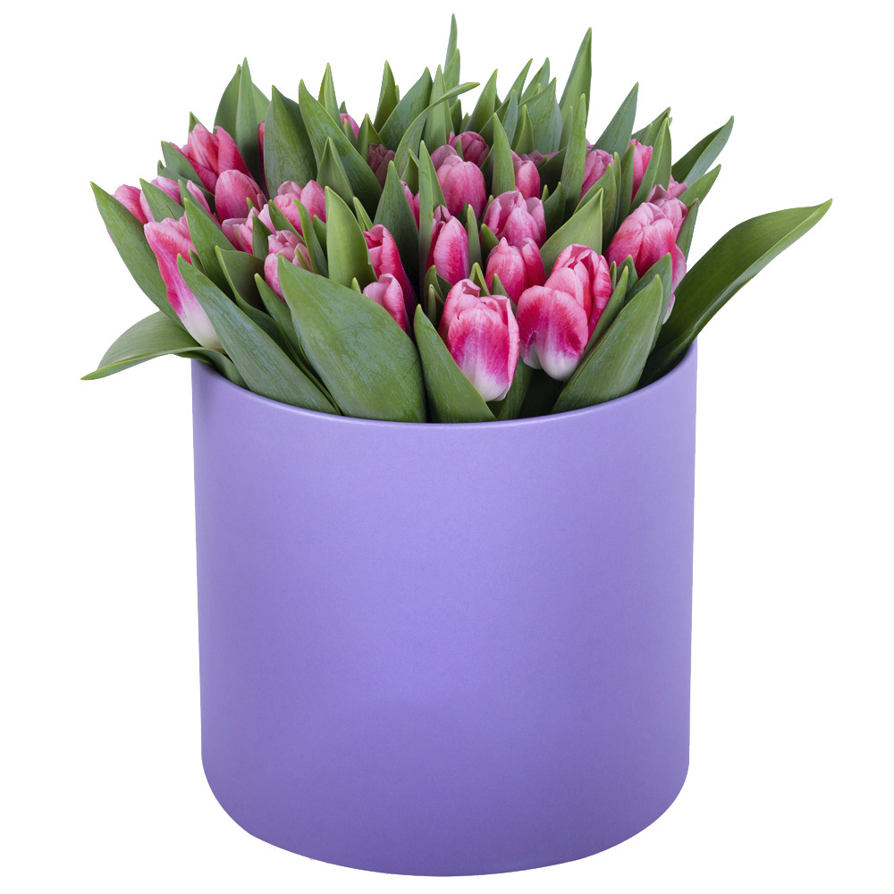 51 Бело-малиновый тюльпан в фиолетовой шляпной коробке