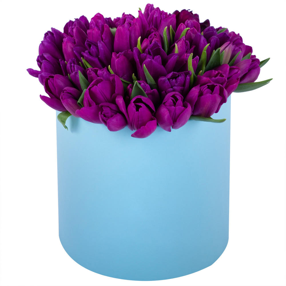 51 фиолетовый тюльпан в голубой шляпной коробке