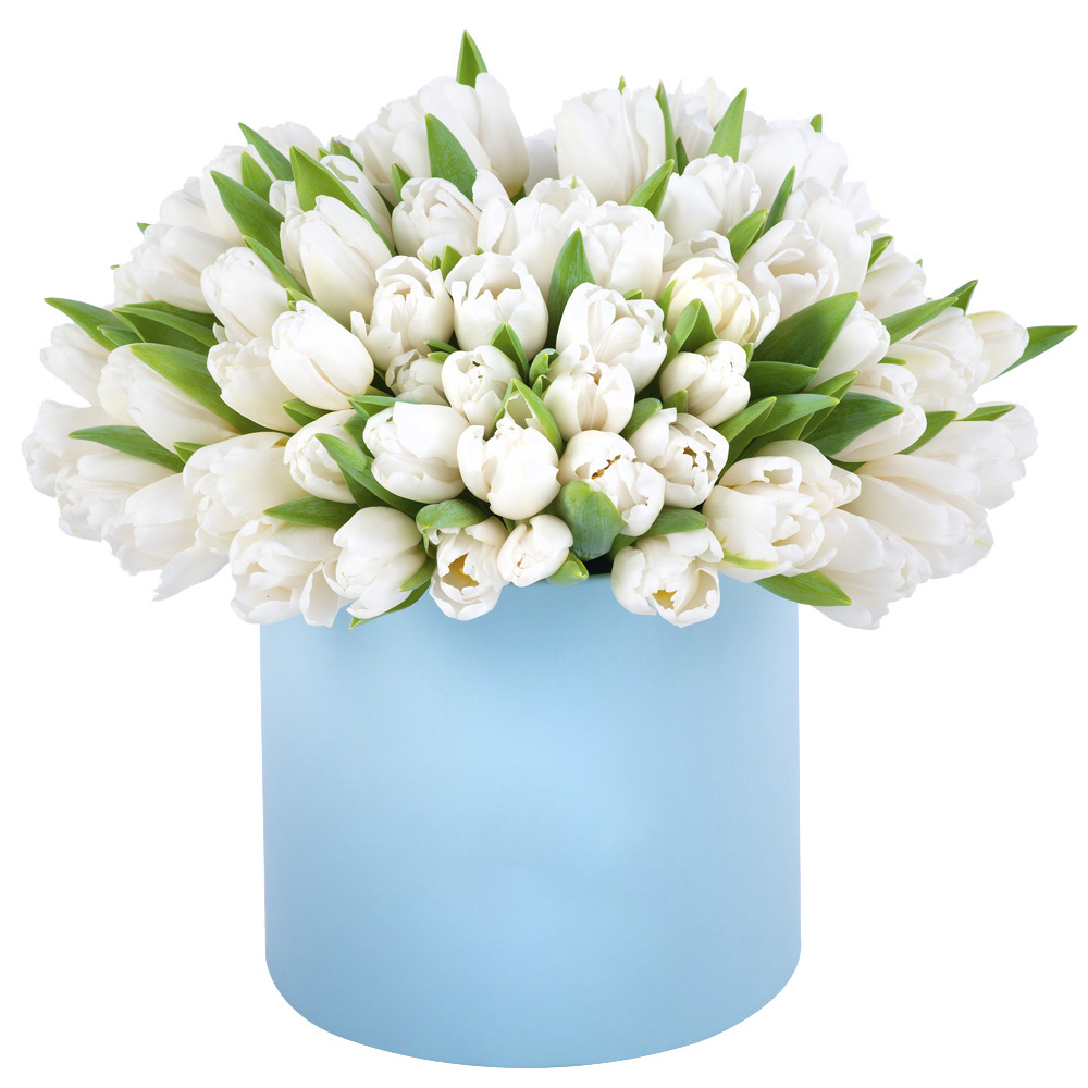 101 белый тюльпан в голубой шляпной коробке