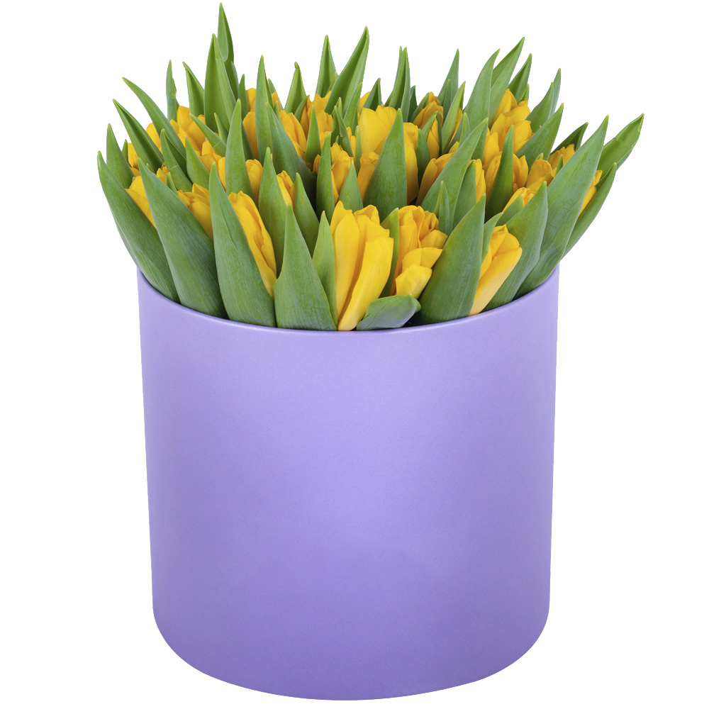 51 желтый тюльпан в фиолетовой шляпной коробке